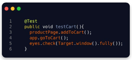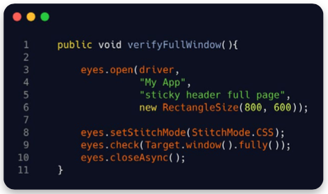 While calls to the Eyes API can be made directly within a test function, we recommend abstracting the calls into a separate utility class. In doing so, if there are any changes to the API, the required changes to the test code will be limited to an individual class.