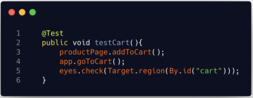 Be careful not to scope your test too narrowly. For example, scoping the cart test just to the product line would miss other important information about the cart like the cart totals and button states. Scope wide enough to catch everything you need to test, but narrow enough that you’re not capturing parts of the screen that would be problematic to include in your test.