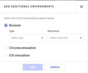 - Add Environment (New) – allows you to select Ultrafast Test Cloud environments. You can select the same test to run on multiple environments: different browser types and viewports for web, Chrome emulation, or iOS simulation for mobile devices. Using Applitools Ultrafast Test Cloud you can now increase your coverage and accelerate your release cycles.