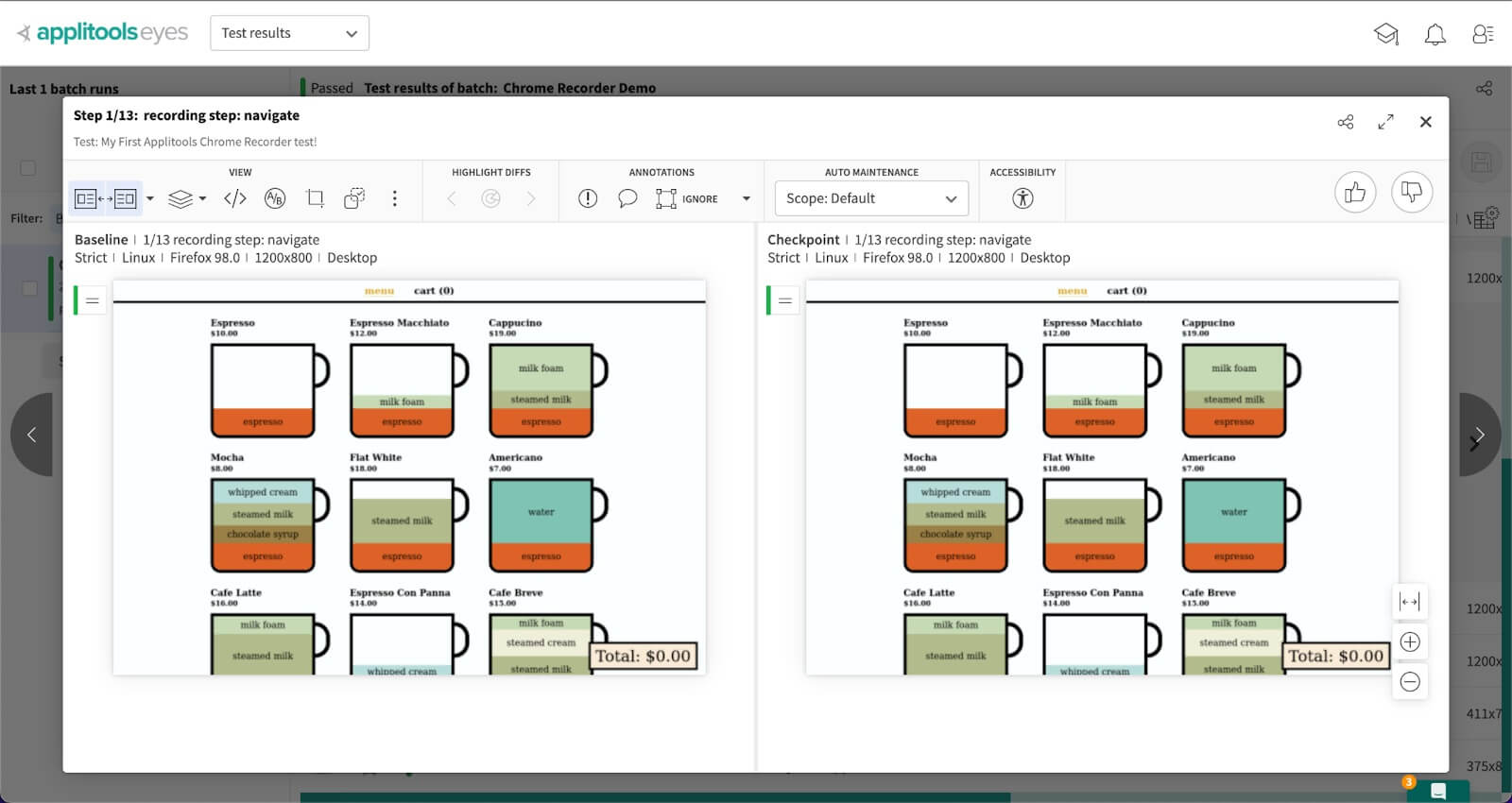 After running the test, you’ll see the results populate in the Applitools dashboard. In this case, our baseline and our checkpoint have no visual differences, so everything passed.
