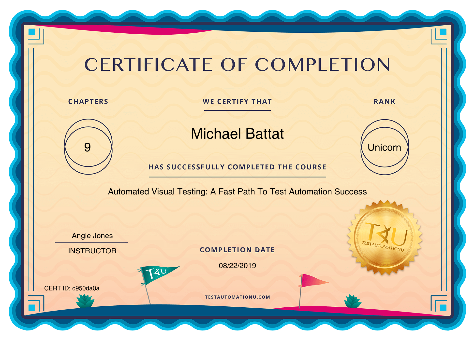 As always, when I finish a course on Test Automation University, I like to display my completion certificate.