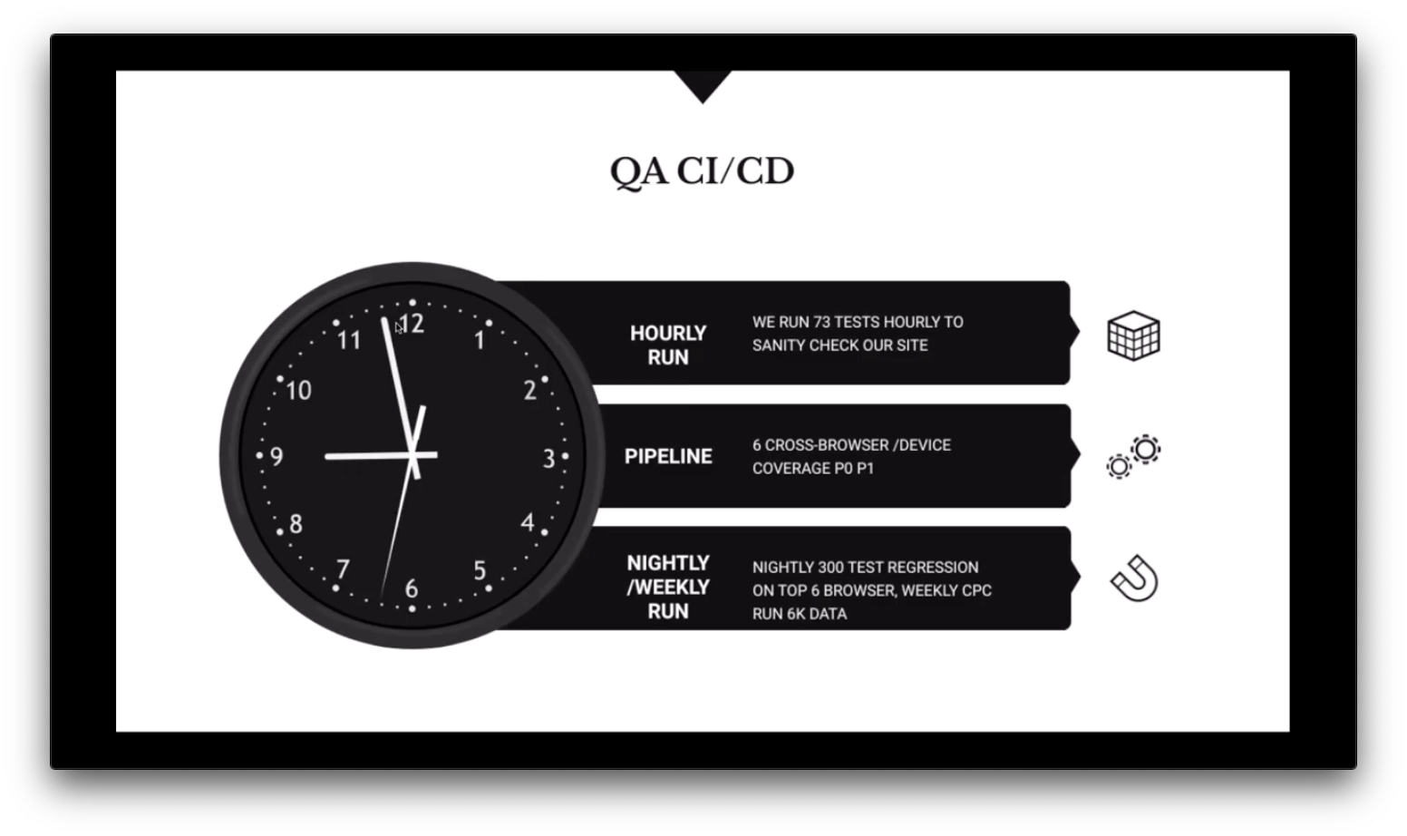 • By October 2018 they had fully automated P0/P1 tests. Her team had added Spinnaker pipeline integration. They were running cross-browser testing with real mobile device tests.