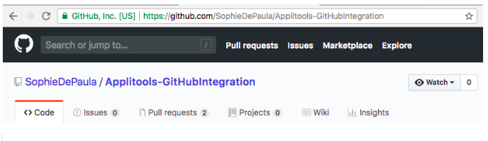 • GitHub Repository Name – You can find the name of any particular GitHub repo at the top of its page. In the example below, the repo name is Applitools-GitHubIntegration.