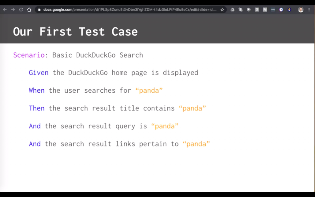 In the first chapter, Andrew has you write your first test. Not in Python, but in Gherkin. If you have never used Gherkin syntax, it helps you structure your tests in a pseudocode that you can translate into any language of your choice. Andrew points out that it’s important to write your tests steps before you write test code – and Gherkin makes this process straightforward.