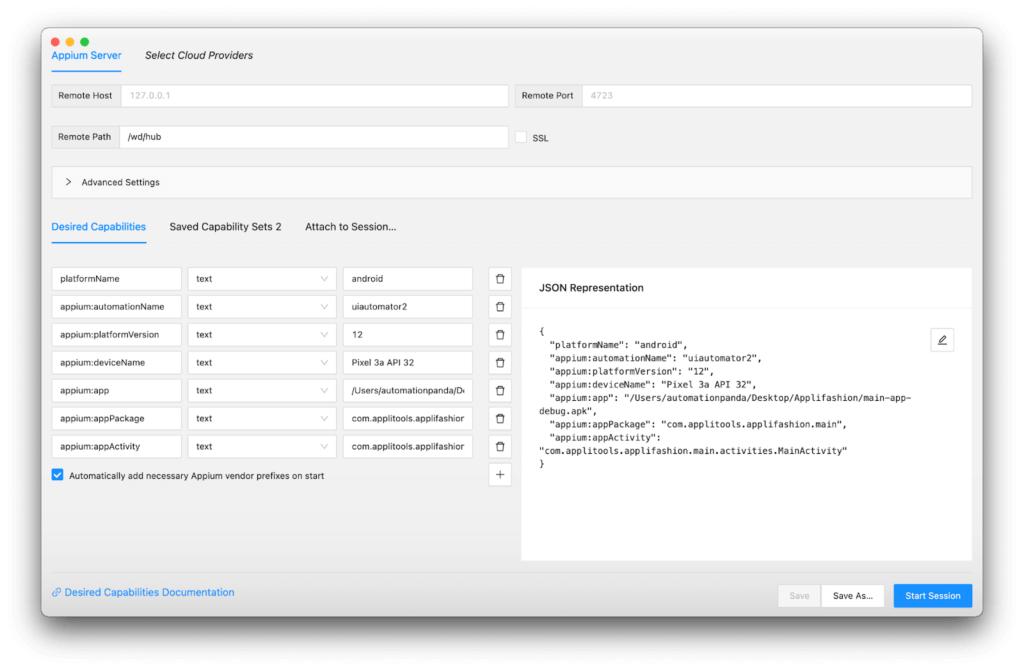 - I used the default remote host (127.0.0.1) and remote port (4723).