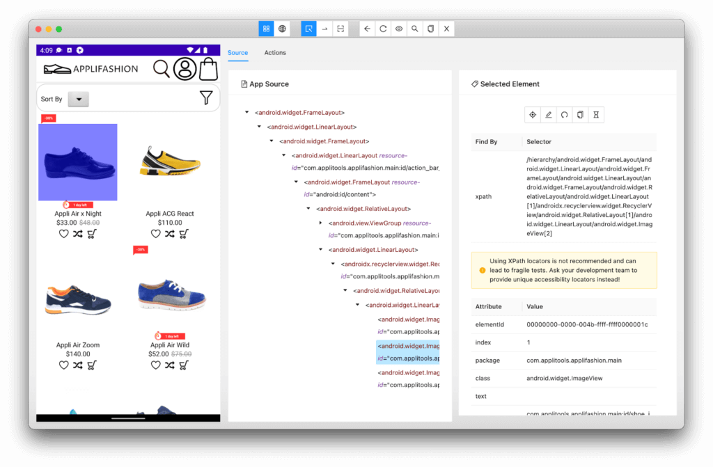 I wrote one test case that performs shoe shopping. It loads the main page and then opens a product page using locators I found with Appium Inspector: