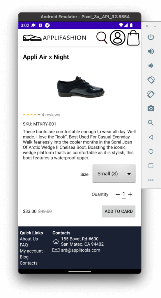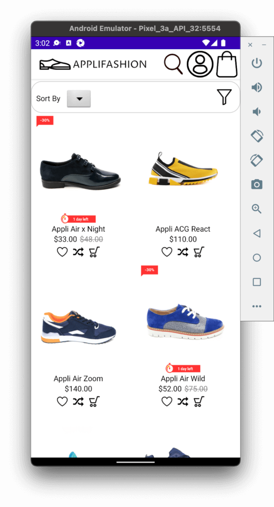 Once my workbench was ready, I opened the Applifashion code in Android Studio, created a Pixel 3a emulator in Device Manager, and ran the app. Here’s what it looked like: