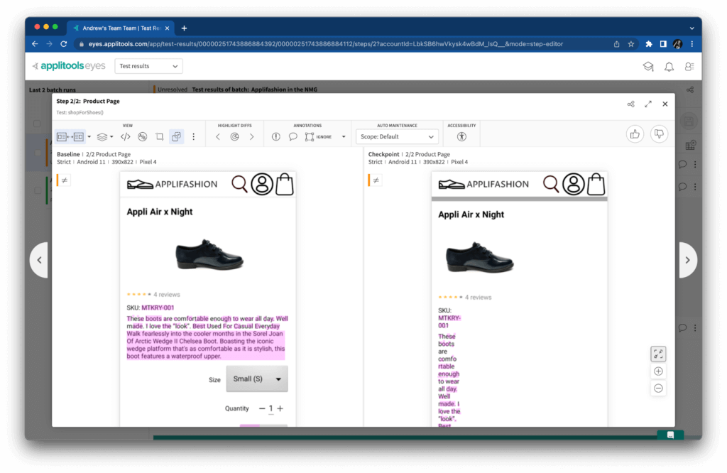 The formatting for the product page was too narrow! “Traditional” assertions would probably miss this type of bug because all the content is still on the page, but visual assertions caught it right away. Visual checkpoints worked the same on NML as they would on UFG or even with the classic (e.g. local machine) Applitools runner.