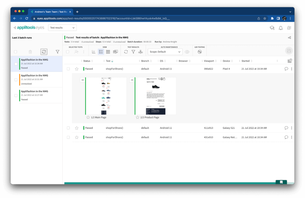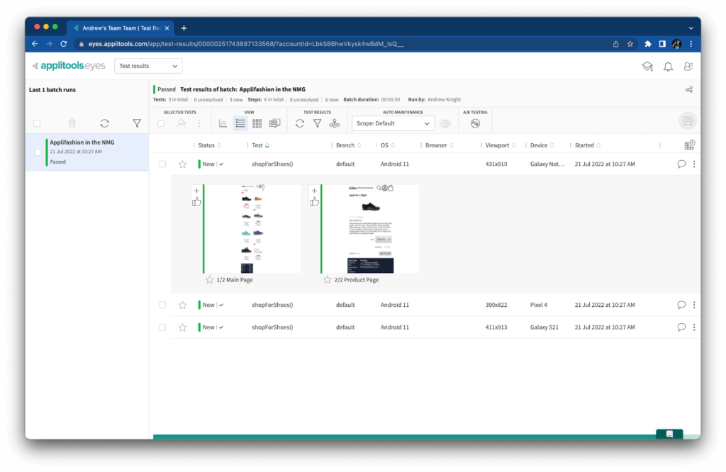 When I ran the test with these visual assertions, it ran one time locally, and then NML ran each snapshot against the three target devices I specified. Here’s a look from the Applitools Eyes dashboard at some of the snapshots it captured: