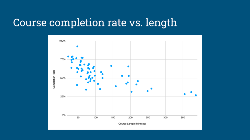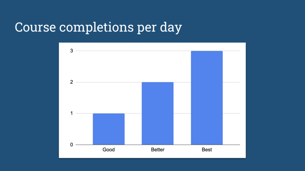 My goal for any course we publish – and how I determine if a course is “successful” in most basic terms – is to consistently hit 30 completions per month, or 1 completion per day. Very popular courses hit 2 completions per day, and our most popular courses hit at least 3 completions per day.