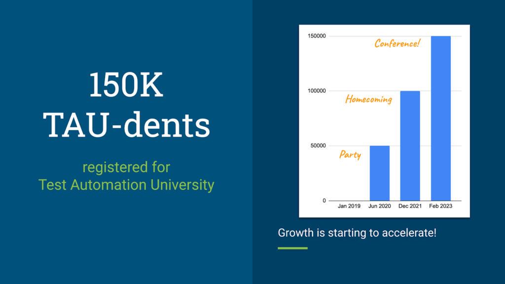 Every time we’ve hit a milestone, we’ve celebrated. When we hit 50 thousand students in June 2020, we threw our first TAU Party. Then, when we hit 100 thousand students, we hosted TAU: The Homecoming, our first virtual conference. That’s when I first joined Applitools. Now, at 150 thousand students, we’re hosting our second virtual conference.