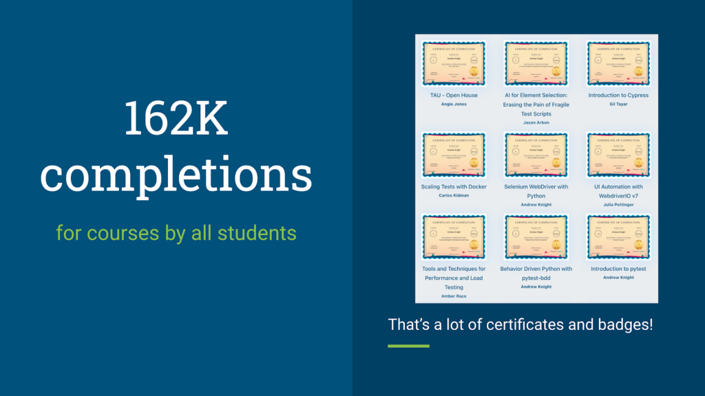 Our top 10 courses are all in that upper echelon of completion rate. Our most popular course by far is Angie Jones’ Setting a Foundation for Successful Test Automation, followed by my course, Web Element Locator Strategies.