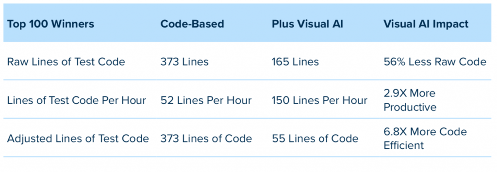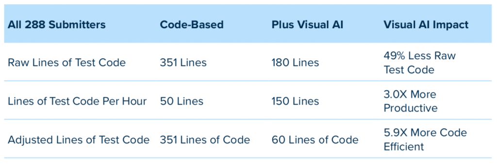 By comparing and contrasting these different groups in the report, we learn more about the impact of Visual AI on test code efficiency.