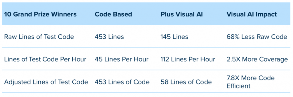 What really stands out here is the fact that Grand Prize Winners, when using a code-based approach exclusively, needed an additional 102 lines of adjusted test code to complete their winning entries. That’s a 29% expansion to our code-based framework really well and cover 90% or more of potential failure modes. In the real world, we simply don’t have the time to write 351 lines of code very often, much less 453. Especially knowing we then have to maintain these suites indefinitely to support our tests going forward. That’s the very definition of inefficient.