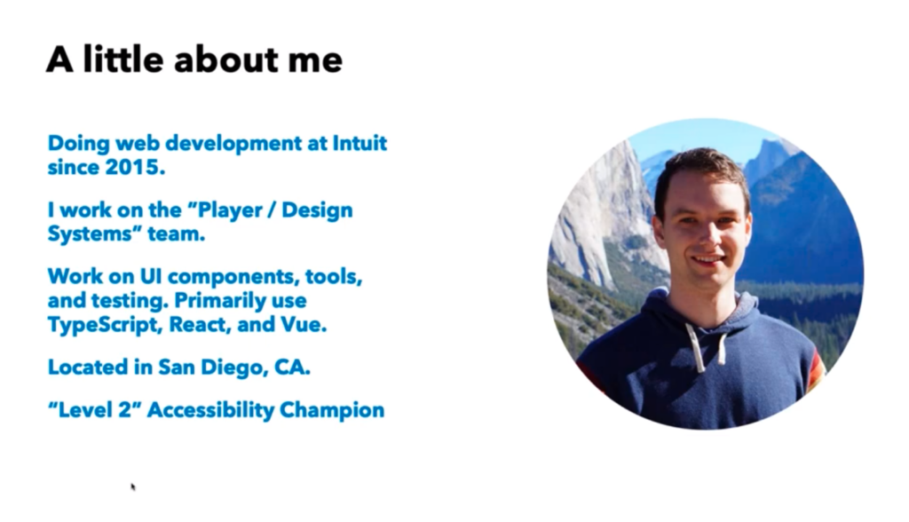 Tyler has been working on web development at Intuit since 2015. These days, he works on UI components, tools, and testing. He primarily uses TypeScript, React and Vue. He also focuses on accessibility, and he serves as a “Level 2” Accessibility Champion inside Intuit.As part of Tyler’s job, he ensures that design systems are testable.