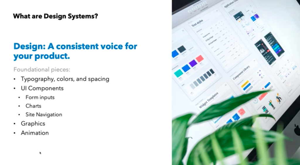 “Design” turns into a consistent voice for your product. Those are things like typography, colors, and spacing, as well as UI components (forms, charts, site navigation), Graphics and Animation standards. These help standardize the visualization – the “look” – of the application. One can imagine an application developed by a large team that lacked a standard design – it would be disorienting to customers who expect consistency from software. A design system lets you take base pieces, document them well, and reuse them.