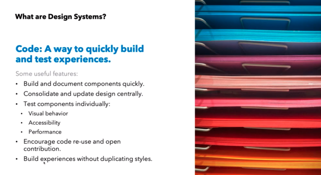 First, Tyler sees design systems as really “Design + Code.” One part of a design system are the “design” – the common components and patterns that get used throughout products. The other part of the design system, Code, involves chunks of functionality interacting with design developers can reuse across a product. For example, CSS Frameworks, or React, or in some other way that lets teams reuse the same code.