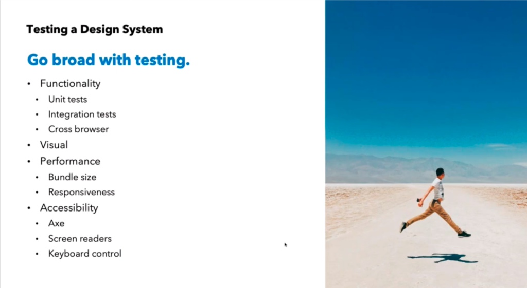 Since the design system represents all the functionality and visual representation of the application, Tyler recommends going broad with testing across all the elements, including: