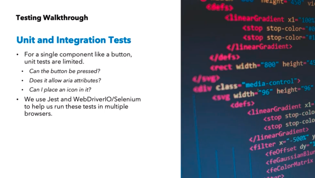 First, Tyler looked at unit tests. Does the button click? Can the button work with an icon associated with it? Will the button work with an transparent background? Does the button work with assigned ARIA (Accessible Rich Internet Applications) attributes? Testing puts these Storybook components through their paces.