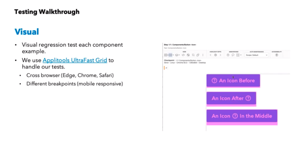 So, for instance, Intuit can see if a collection of multiple new components violate spacing guidelines or other design requirements on pages. Applitools Ultrafast Grid helps Intuit do this evaluation.