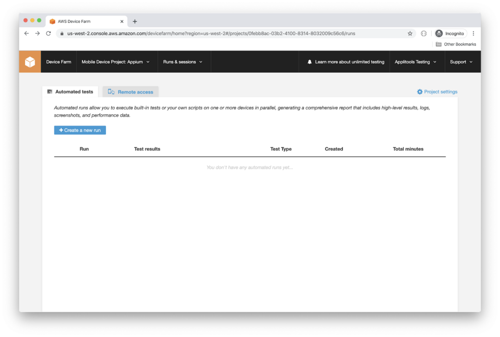 Now that the test runs locally, let’s run it on AWS Device Farm. Start by creating a new account on Amazon Web Service website.