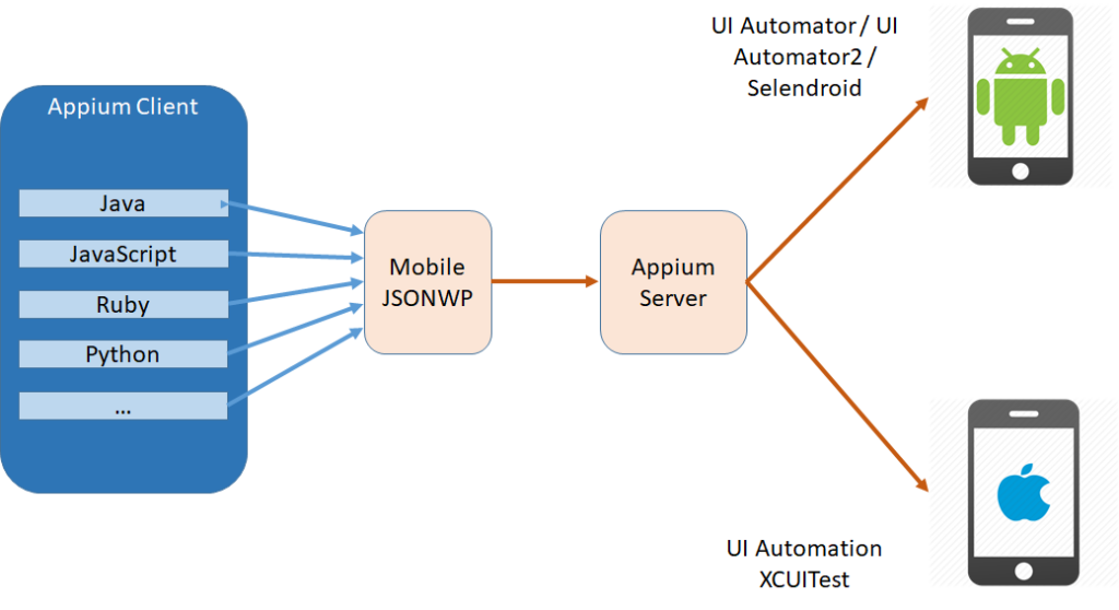 It’s an HTTP Server written in Node.js that creates and handles WebDriver sessions. When you install Appium, you are actually installing the Appium Server. It follows the same approach as the Selenium WebDriver, which receives HTTP requests from the Client Libraries in JSON format with the help of JSONWP. It then handles those HTTP Requests in different ways. That’s why you can make use of Selenium WebDriver language bindings, client libraries and infrastructure to connect to the Appium Server.