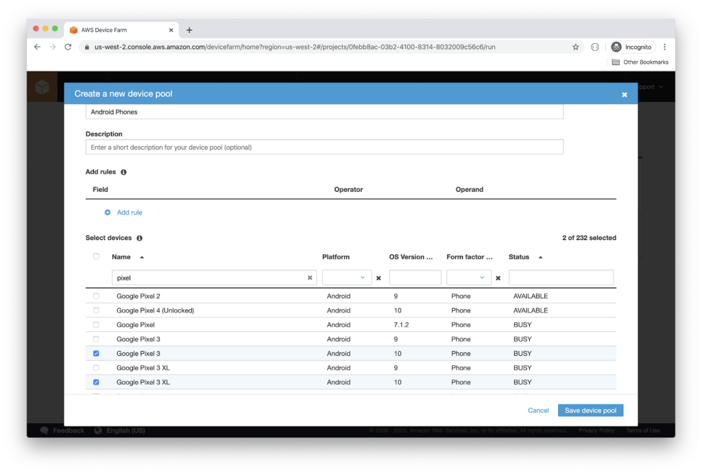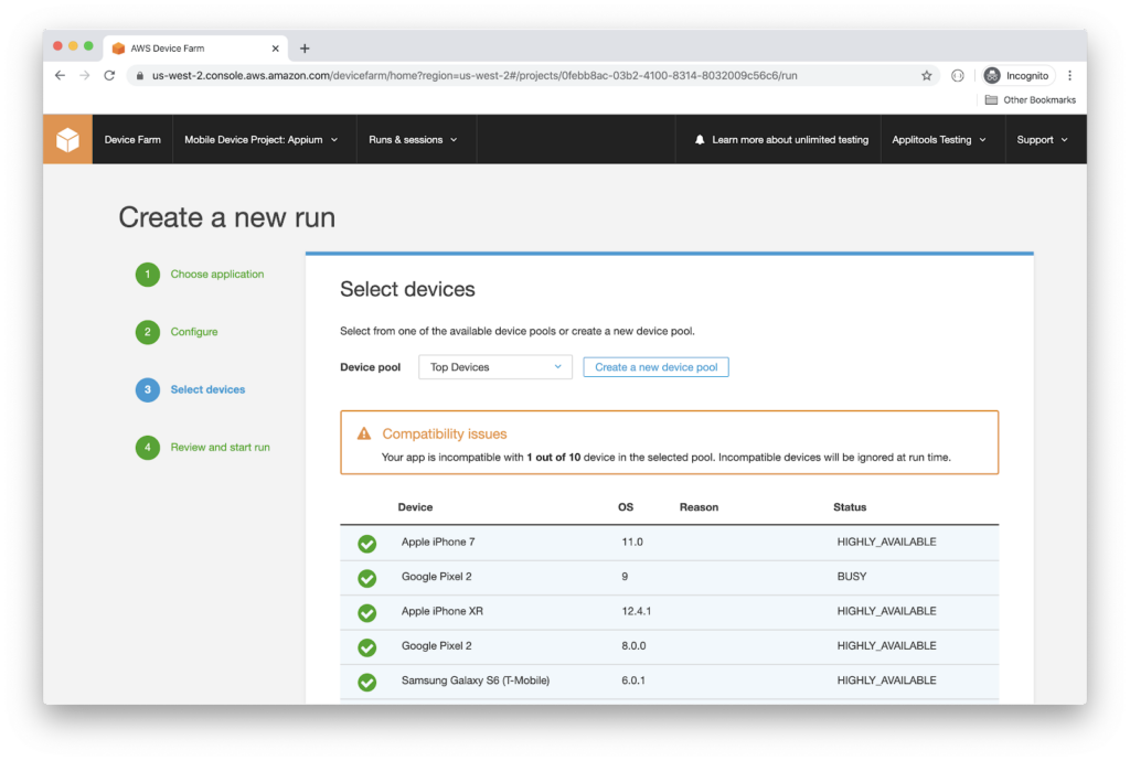 - It’s time to select the devices that you want to run the test script against. I will pick up a customized list of devices. Therefore, click the Create a new device pool button.