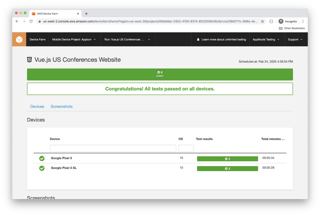 Switch back to the Applitools Test Manager, and verify the results of this second run via AWS Device Farm.