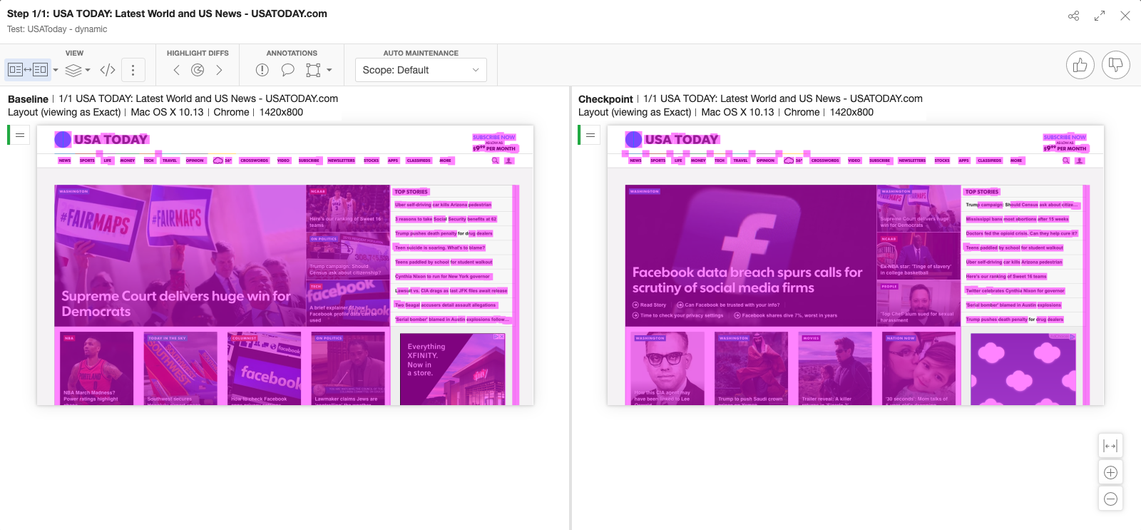 This is a comparison of two different USA Today homepage images. When an AI-powered tool looks at the layout comparison, the layout framework matters, not the content. Layout comparison ignores content differences; instead, layout comparison validates the existence of the content and relative placement. Compare that with a bitmap comparison of the same two pages (also called “exact comparison:):